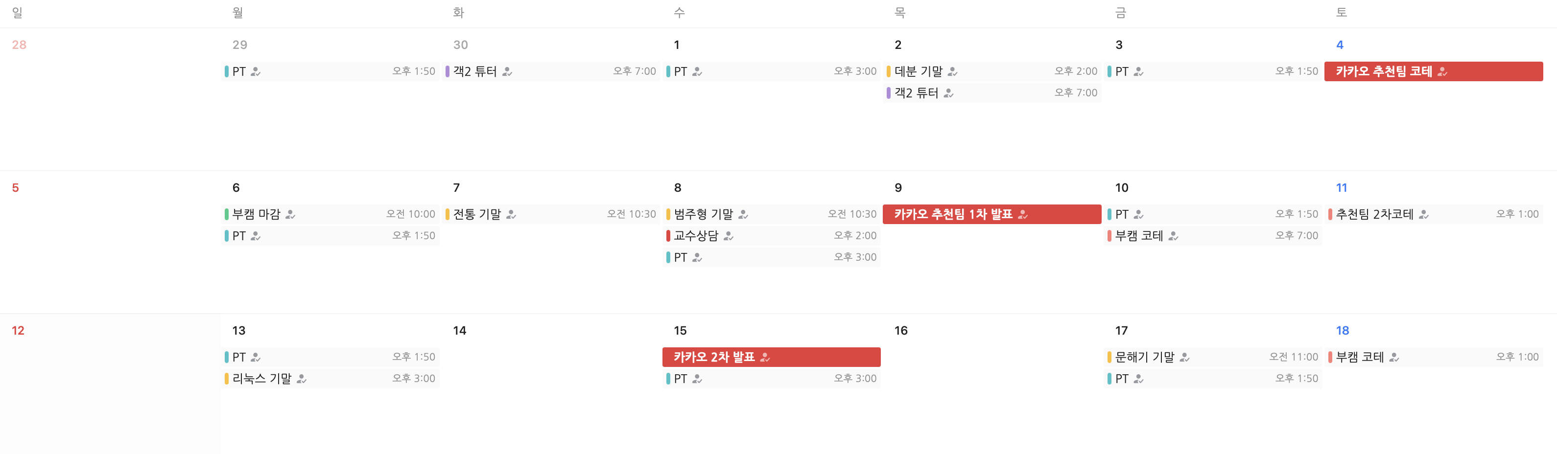 빨간 일정은 코테랑 합격자 발표, 노란색은 시험일정인데 진짜 너무 힘들었었다.