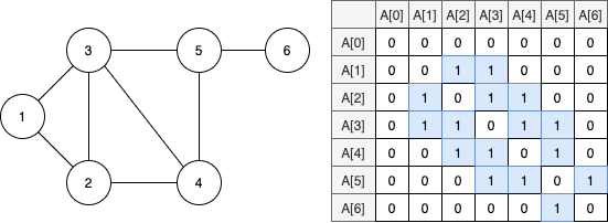 인접 행렬은 모든 정점을 2차원 배열로 만들고 저장한다. 그리고 간선의 연결 정보를 좌표로 표시해서 저장한다. 모든 정점의 순서쌍을 만들어서 저장하므로 $ O(V^2)$ 의 공간복잡도를 갖는다. 따라서 상당히 많은 메모리를 차지하므로 너무 많은 정점을 갖는 그래프에서는 잘 사용하지 않는다. 하지만 특정 간선을 확인해야하는 경우에서 굉장히 빠른 속도를 보여준다.