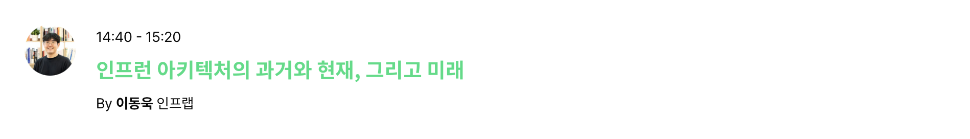 두번째 세션은 제가 앞서 말한 기대한 세션 중 하나였습니다. 유튜브에서 이동욱님의 영상을 많이 본 것도 있고 말을 굉장히 잘하신다고 생각해서 꼭 듣고 싶었습니다. 그리고 무엇보다 한 기업의 CTO이고 인프랩이라는 크지 않고 발전하는 기업의 아키텍처와 CTO의 생각을 보면서 아키텍처 구성과 기업 발전 과정에서의 고민들을 알고 싶었습니다.