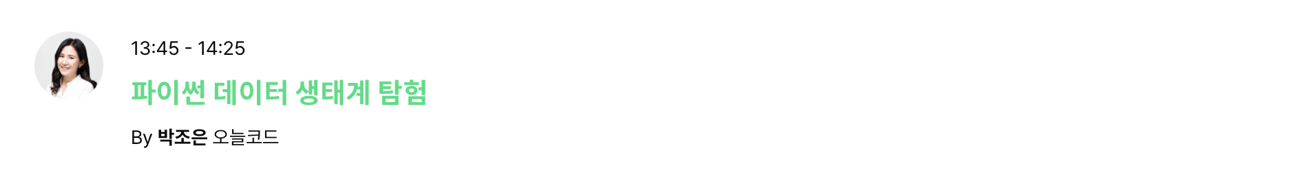 첫 세션은 가볍게 가기로 결정했습니다. 동시간대 다른 강연들에 흥미가 가는 부분은 없기도 했고 같이 간 친구가 듣고 싶어했던 것도 있었습니다. 무엇보다 파이썬을 활용한 데이터 관련 내용들은 제가 잘 알고 있는 부분도 있었기 때문에 너무 복잡하게 생각하지 않아도 될 거라 생각했습니다.