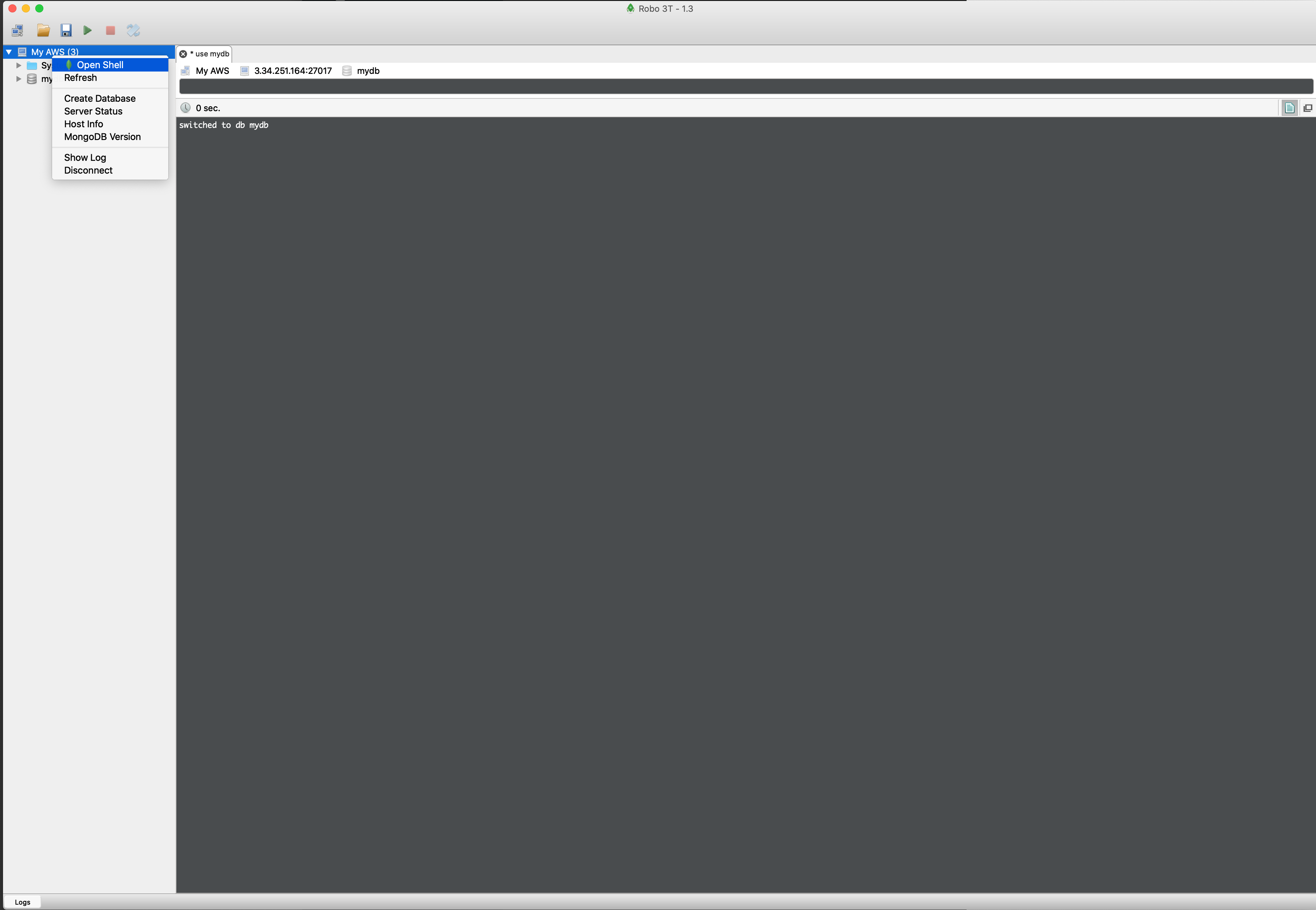 설정한 서버를 우클릭하면 Create Database말고 Open Shell이 나온다. 여기서 다음과 같은 명령어를 실행하면된다.