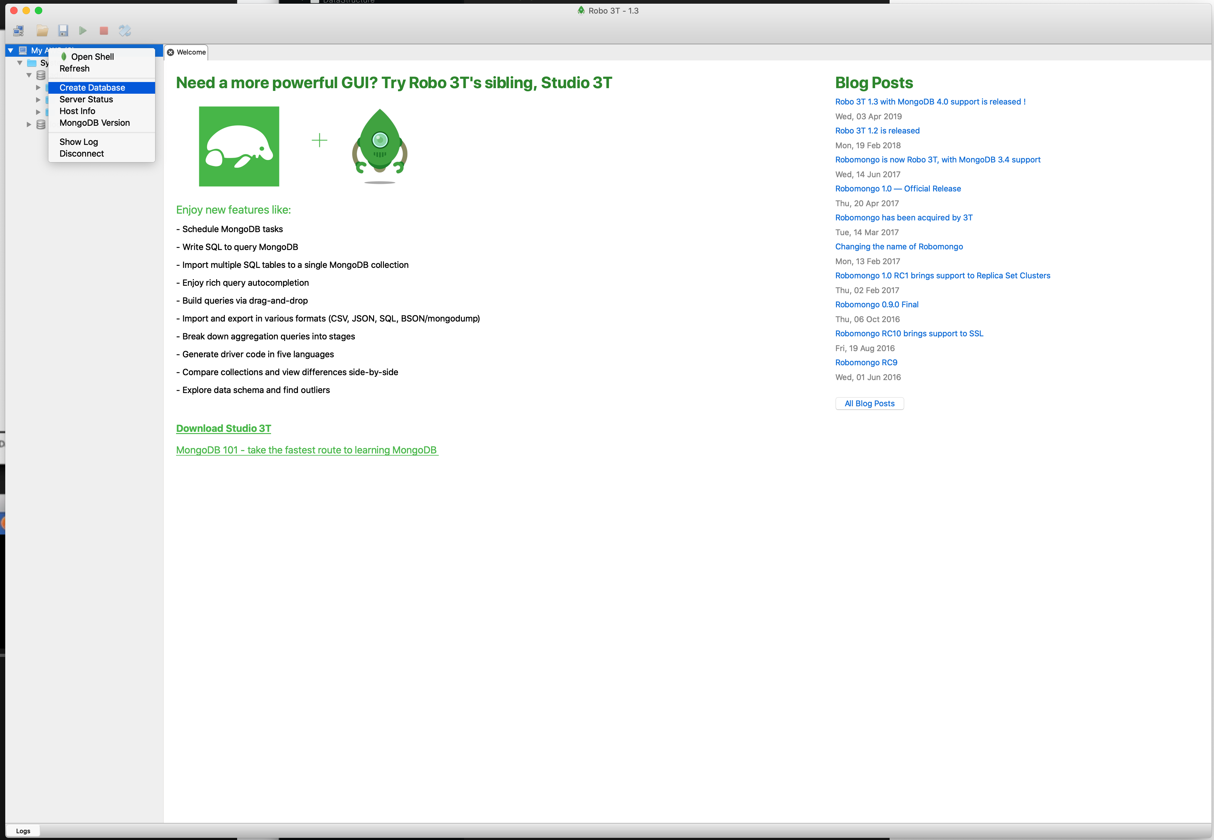 몽고DB를 설치하고 활용하는 과정에서 GUI프로그램으로 Robo 3T를 사용하게된다. 기본적으로 파이썬 프로그래밍이나 DB를 다룰 때 사용되는 콘솔 명령어를 Robo 3T에서도 사용이 가능하지만, GUI 프로그램이므로 클릭으로도 형성이 가능한 경우가 많다.