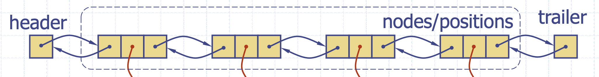 이중 연결리스트는 삽입과 삭제 함수의 일관성을 위해서 header와 trailer라는 dummy node가 존재한다. header의 prev와 trailer의 next는 모두 NULL값을 가리키고 있다.