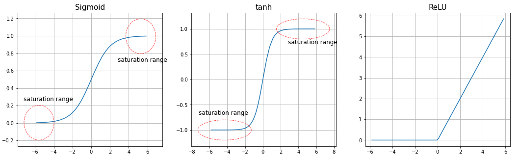 - 기존에 자주 쓰이던 비선형 함수인 $\tanh$, sigmoid는 포화 비선형성 함수(saturating nonlinearities)였음