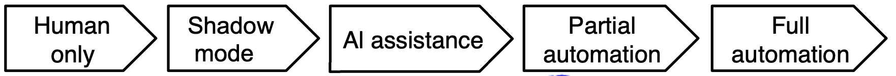 - 중간단계인 AI assistance와 Partial automation 단계에서는 사람의 도움이 함께 존재(human in the loop)