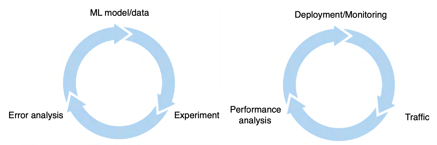 왼쪽은 모델 개발, 오른쪽은 모델의 서비스 배포 관점의 반복적 흐름입니다.