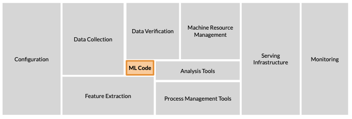 - 실제 머신러닝 시스템에서 ML Code가 차지하는 것은 매우 적은 부분