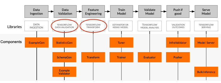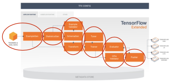 Transform은 feature engineering 역할을 함Tuner와Trainer는 학습과정과 조정단계에 사용Evaluator와InfraValidator는 각각 Deep Learning 분석과 실제로 측정하는 과정에 사용됨