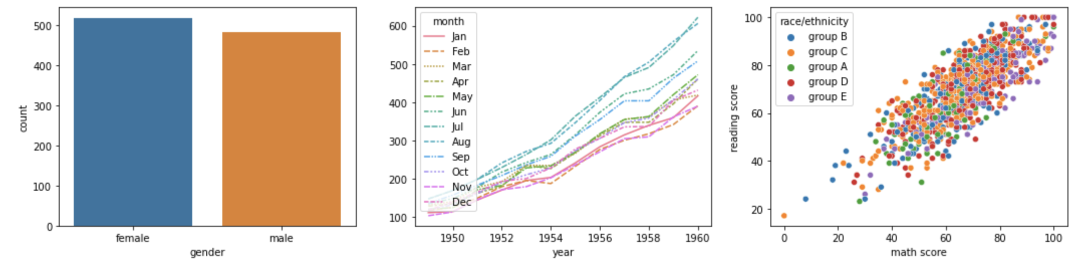 plots = [sns.countplot, sns.lineplot, sns.scatterplot]