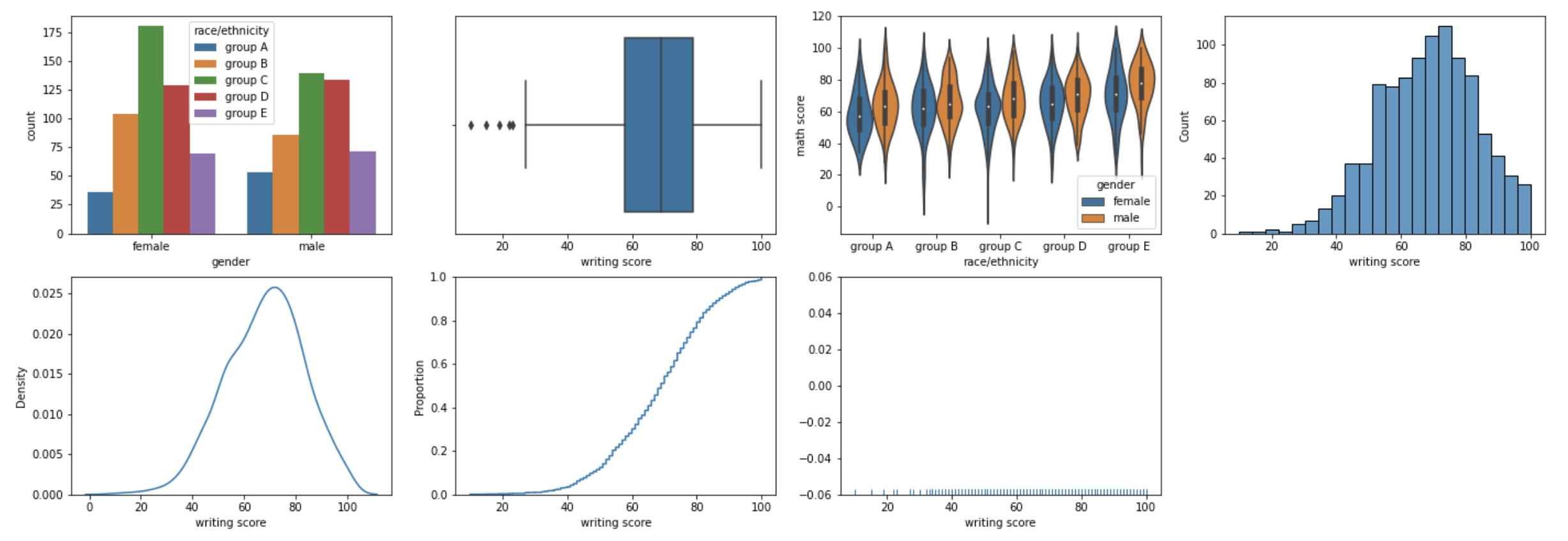 plots = [sns.countplot, sns.boxplot, sns.violinplot, sns.histplot, sns.kdeplot, sns.ecdfplot, sns.rugplot]