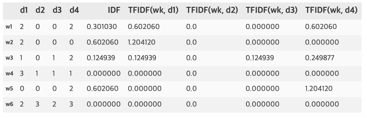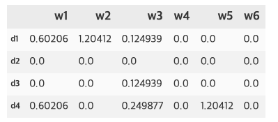 - 대략적으로 d1에 대한 각 단어들의 TF-IDF를 계산하면 이 값은 d1의 vector