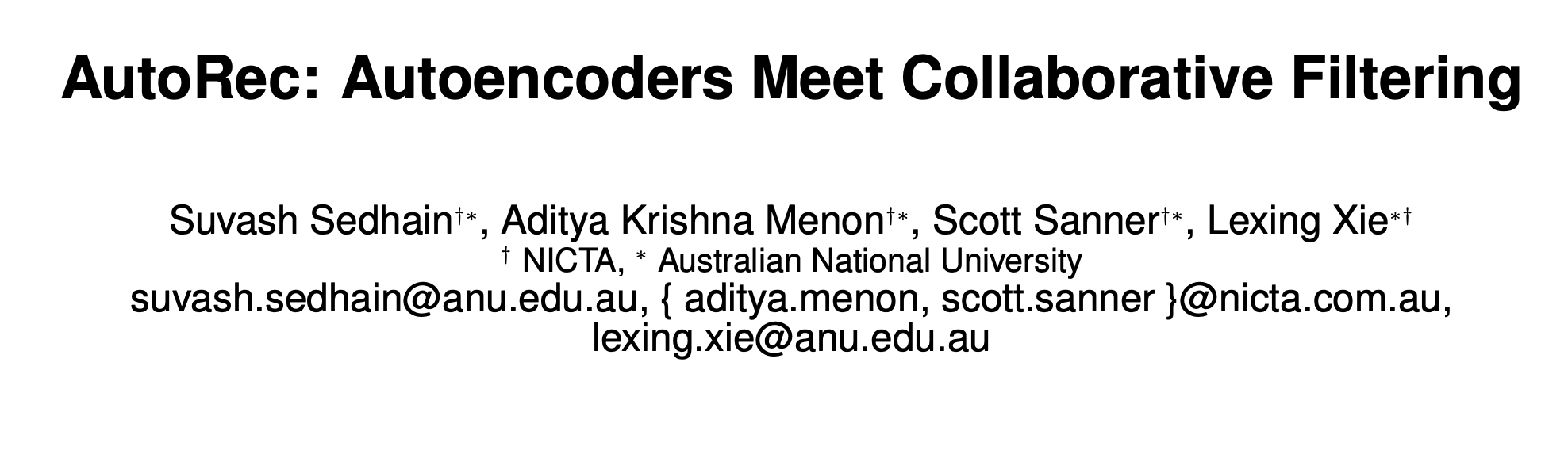 - Paper : AutoRec: Autoencoders Meet Collaborative Filtering