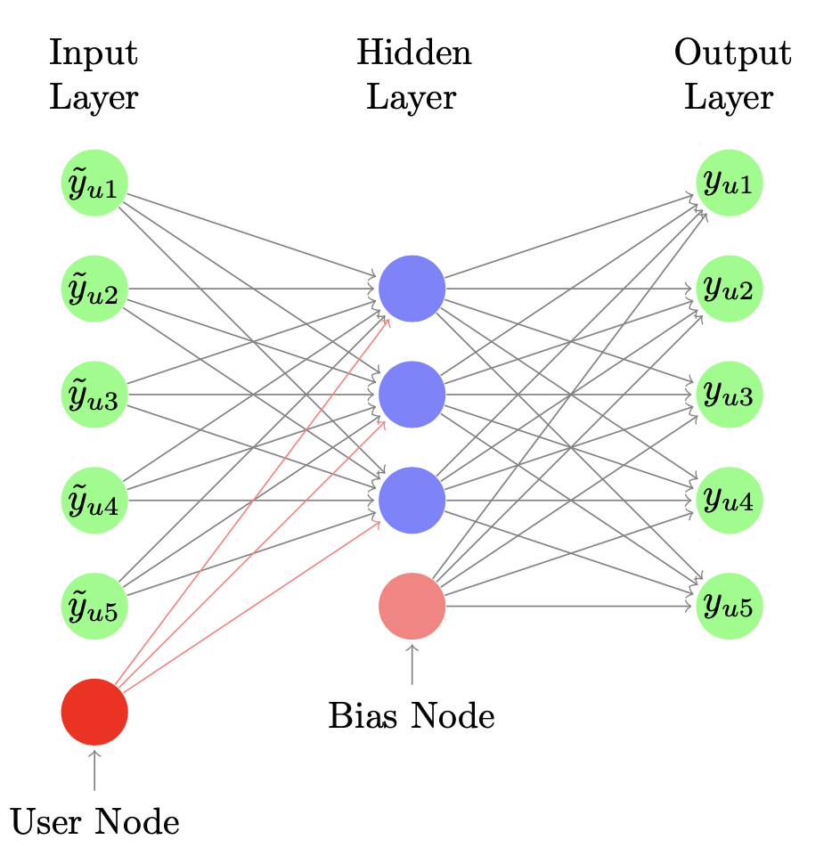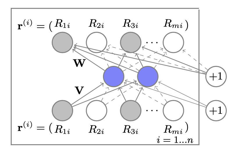\[\begin{aligned} \underset{\theta}{\min}\sum_{\mathbf{r}\in \mathbf{S}} \lVert \mathbf{r} - h(\mathbf{r} ; \theta) \rVert_2^2 \qquad \\\\ h(\mathbf{r} ; \theta) = f(\mathbf{W} \cdot g(\mathbf{V}\mathbf{r} + \boldsymbol{\mu}) + \mathbf{b}) \end{aligned}\]- 기존 rating matrix와 출력으로 생성되는 reconstructed rating matrix의 RMSE를 목적함수로 설정
