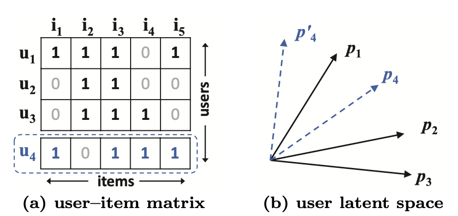 - 실제 논문에서 언급하는 MF의 한계로는 user-item embedding에서는 실제로 $sim_{41}$과의 관계에서 jacard 유사도로 계산하면 $sim_{43}$이 $sim_{42}$보다 더 가깝지만 latent vector space에서는 어떠한 방법을 써도 $sim_{42}$가 더 가깝게 위치함