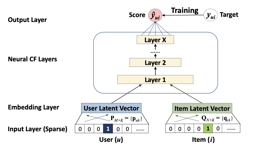 - $ \widehat{y}_{ui} = \phi_o (\phi_X(\cdots\phi_2(\phi_1 (P^\intercal v_u, Q^\intercal v_i))\cdots)) $