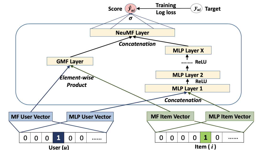 - $\widehat{y}_{u,i} = \sigma\left( h^\intercal \begin{bmatrix} \phi^{GMF} \ \phi^{MLP} \end{bmatrix} \right)$