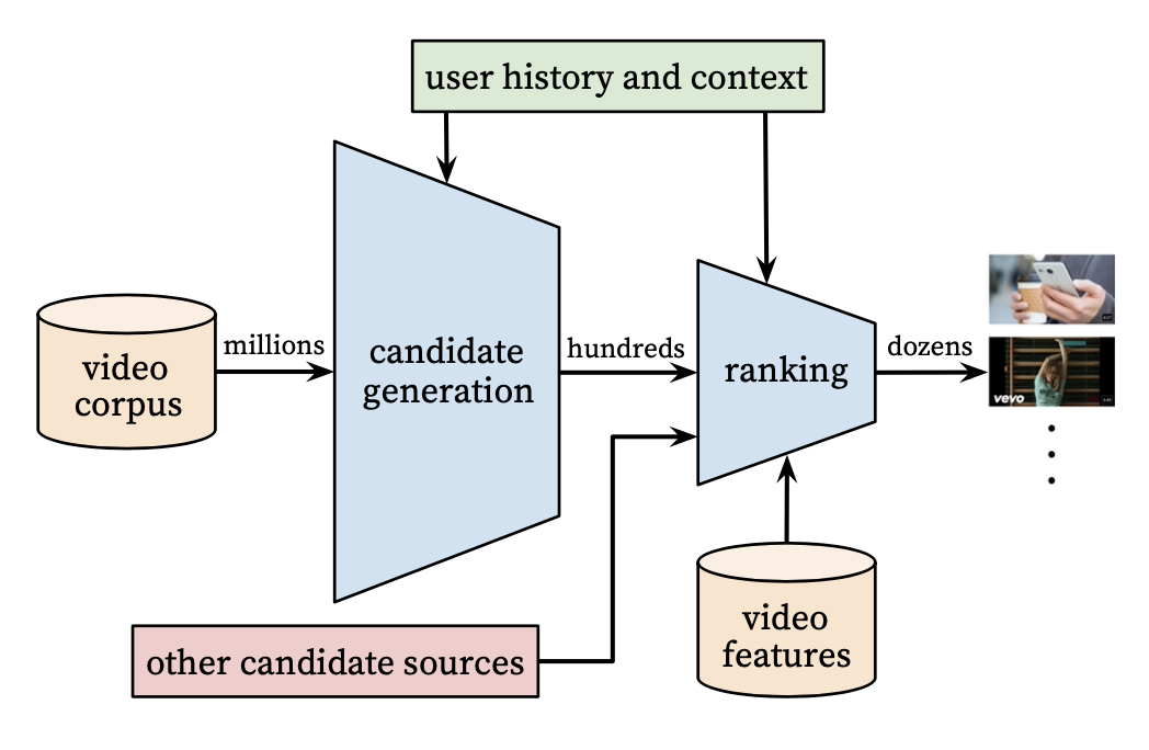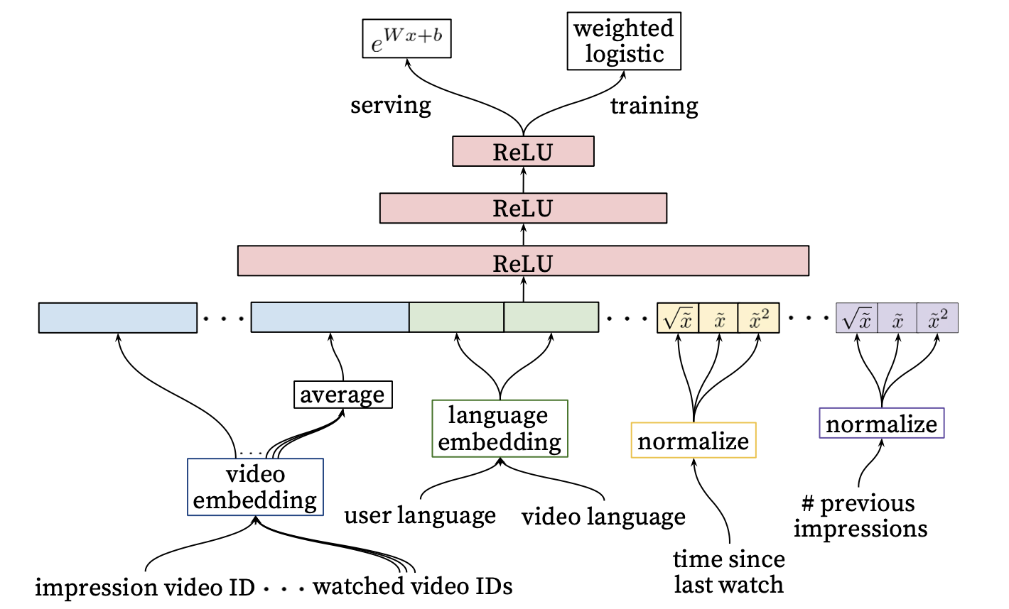 - Candidate Generation에서 생성된 추천 후보군에서 유저, 비디오 등 feature를 다채롭게 사용하여 최종 추천 리스트 제공