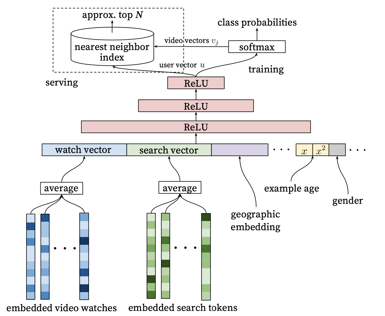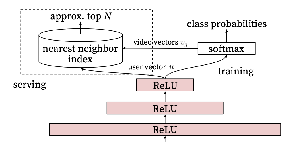 - 따라서 실제 serving에는 user vector와 video vector embedding index를 활용해 수백개의 리스트에서 Annoy와 Faiss등으로 Top-N을 추출하여 전달