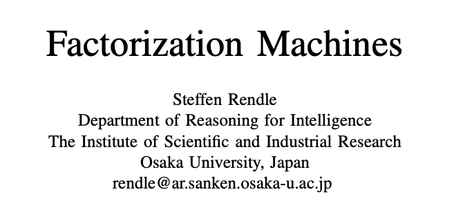 \[\hat{y}(x) = \underbrace{w_0 + \sum_{i=1}^n w_i x_i}_{\text{Logistic term}} + \underbrace{\sum_{i=1}^{n}\sum_{j=i+1}^{n} \langle v_i, v_j \rangle x_i x_j}_{\text{Factorization term}}\] \[w_0 \in \mathbb{R}, \quad w_i \in \mathbb{R}, \quad v_i \in \mathbb{R}^k\]- 논문에서 제시한 모델의 수식은 크게 2개의 항으로 나눠짐