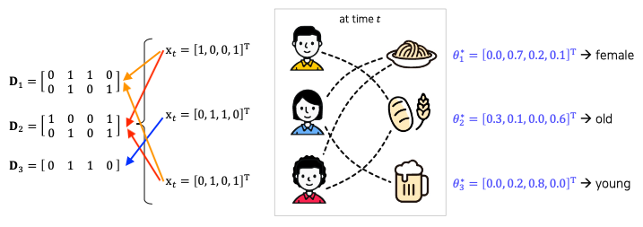 - $\mathbf{D}_i$는 i번째 아이템을 선택한 user $x$의 특징 벡터