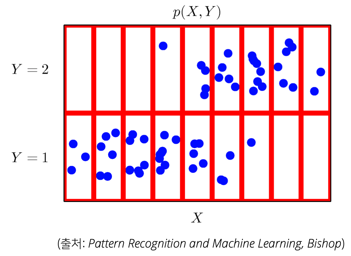 - 위에 있는 사진의 데이터를 기준으로 설명을 하면 나눠진 9개의 칸을 왼쪽부터 1 ~ 9라고 하면 X가 1일때 점의 개수, 2일때 점의 개수 같은 것을 주변확률분포라고 한다.