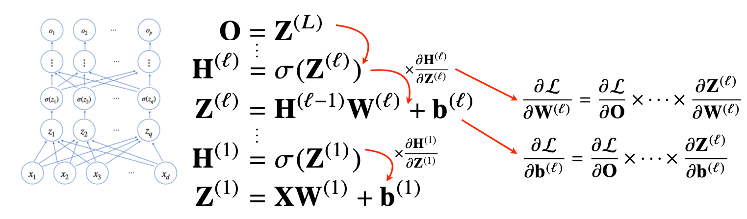 - 손실함수는 $\mathcal{L}$이라 했을때 역전파는 $\sigma\mathcal{L}/\sigma\mathbf{W}^{(l)}$ 정보를 계산할 때 사용된다.