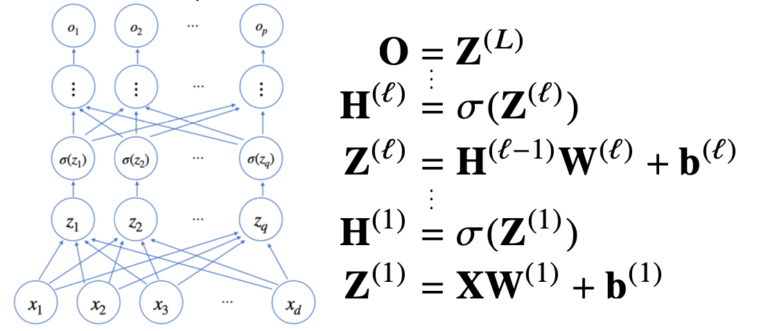- MLP의 파라미터는 $L$개의 가중치 행렬 $\mathbf{W}^{(L)}, …, \mathbf{W}^{(1)}$로 구성된다.