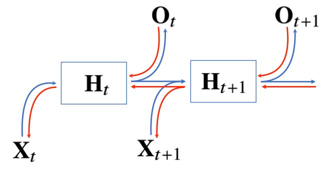 \[\begin{aligned} X_{t} \sim P(X_t | X_{t-1}, H_t) \quad \\ X_{t+1} \sim P(X_{t+1} | X_{t}, H_{t+1}) \end{aligned} \quad\quad H_t = \text{Net}_{\theta}(H+{t-1}, X_{t-1})\]